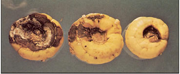 This corm disease is caused by a fungus called Stromatinia gladioli and is most prevalent during periods of cool wet weather and as such can be a particular problem in northern European climates. The first signs of disease are usually on the growing plant and are evident by the yellowing of leaves which eventually shrivel and die. Evidence of the disease on the corms is the appearance of reddish brown markings which are sunken and if the corm is dissected, dark markings are seen as a marbling emanating from the centre. A particular problem with this disease is that the fungus produces an over wintering particles called Sclerotia. As a result diseased corms should never be planted and as a precaution corms should always be harvested in dry conditions. If Stromatinia is suspected in growing plants that soil should not be replanted in subsequent years as the disease is capable of passing from soil to plant.