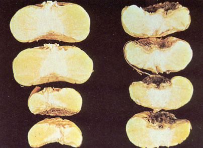 It is the most destructive fungal disease in gladiolus seen during rainy season coinciding with the months between June-October. The symptoms are a yellowing of the leaves starting with the older outside ones first and this is accompanied by the apparent stunting of newer leaves. In addition the spike itself will often be stunted and faded in colour. The plant may also have blackened areas at the base which spread onto the corm. Eventually, if left, the whole plant will wilt and when lifted for destruction, (for this is the only course of treatment), the interior of the corm when opened will appear marbled with a brown colour. Corms are completely rotten emitting foul smell.