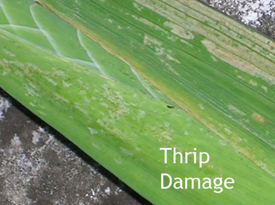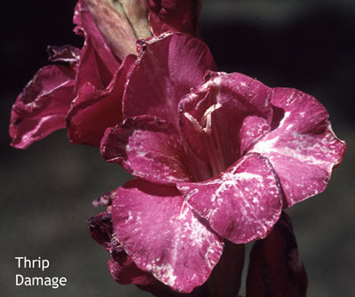 Plants severely infested with gladiolus thrips have a spotted, bleached appearance with silvery streaking between the leaf margins. Both leaves and petals act as a food source and will appear withered. If flower buds are seriously damaged, the flowers fail to open. The entire plant may become stunted.