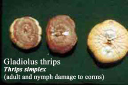 Gladiolus is attacked by many insect pests. Several species of aphids like green peach aphid, potato aphid and melon aphid damage developing foliage and flowers. They can be controlled by using dimethoate. Thrips and caterpillars can be controlled with dimethoate.
