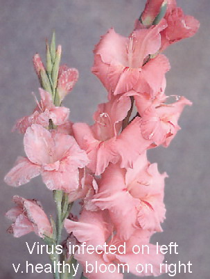 Some viruses cause cause curling of poor small spikes, small corms and poor root development. Important to destroy such plants
