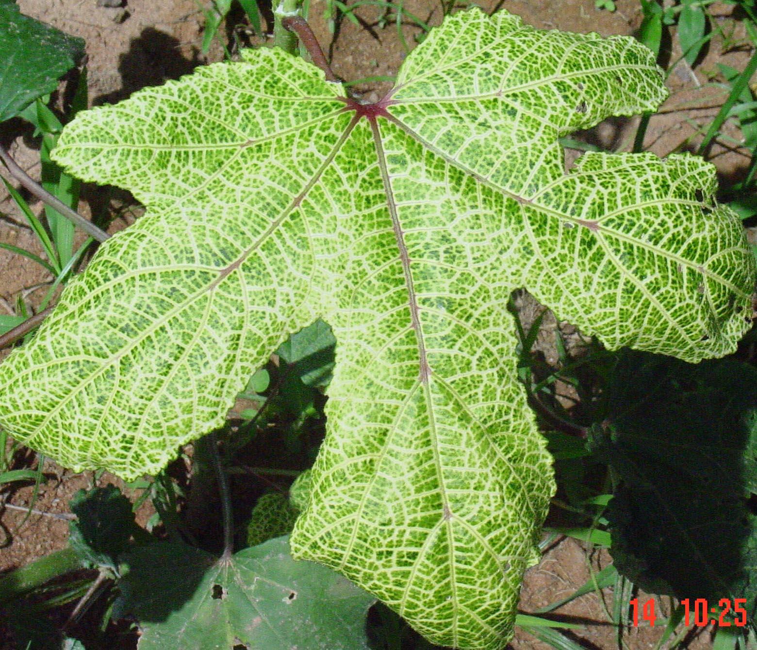 by vein clearing and chlorosis of leaves. The yellow network of veins is very conspicuous