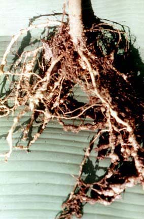 The root knot nematode enters the roots causing characteristic root knots or galls.