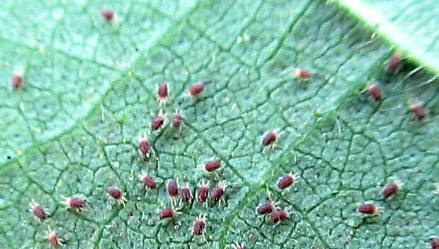 Affected leaves become mottled, turn brown and fall. The infestation of mites is