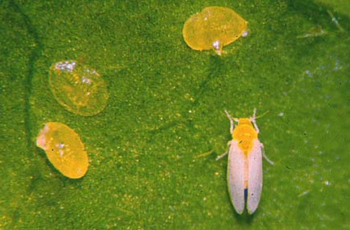 Nymphs and adults of a small, greenish leafhopper suck plant sap from the undersurface