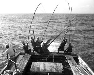 species near the boat (chumming). Poles and lines with barbless hooks are then used