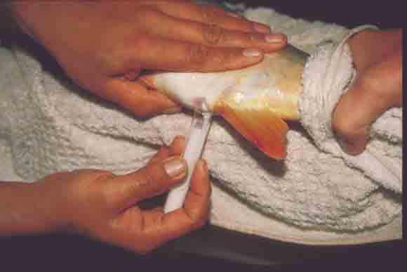 near the shoulder region. For injecting the fish, the needle is inserted under a