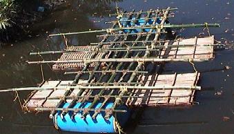 These cages can either be suspended from a raft deployed in bays or backwaters or